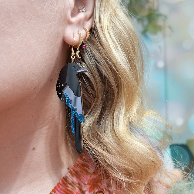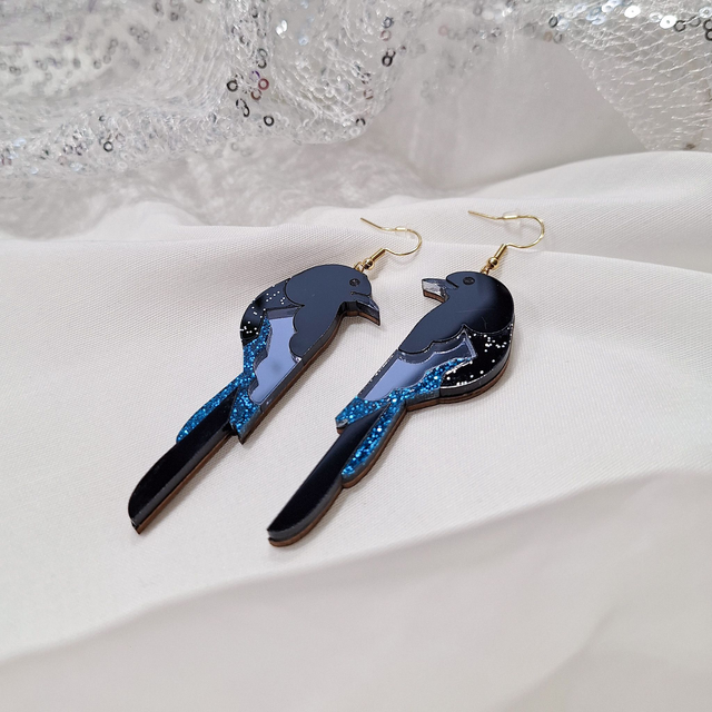 Mustansiniset harakka-korvakorut on valmistettu glitter- ja peiliakryylistä. Mustansininen peiliakryyli ja glitteryksityiskohdat kimaltelevat kauniisti valossa, herättäen katseita ja hyvää mieltä.