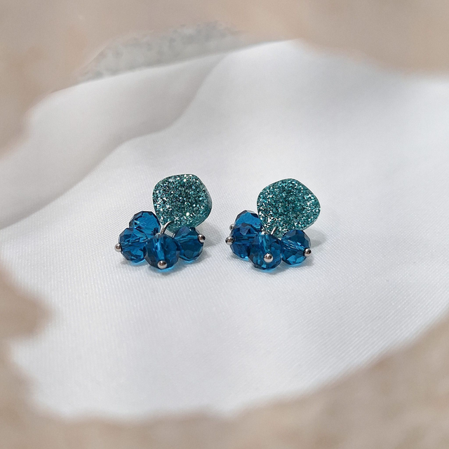 Turkoosin sävyiset helmikorvakorut on valmistettu glitterakryylistä ja lasihelmistä. Glitterpinta ja kirkkaat lasihelmet luovat yhdessä kimmeltävän kokonaisuuden. Näillä koruilla tuot helposti väriä ja iloa asuusi – sopivat täydellisesti sekä arkeen että juhlaan.