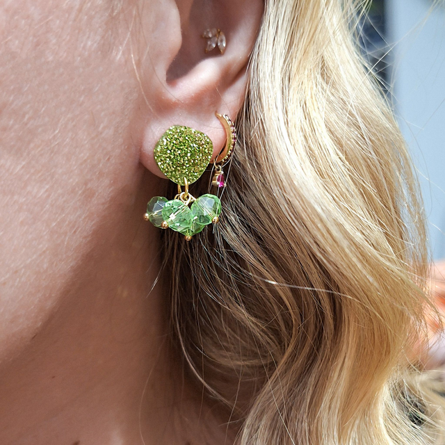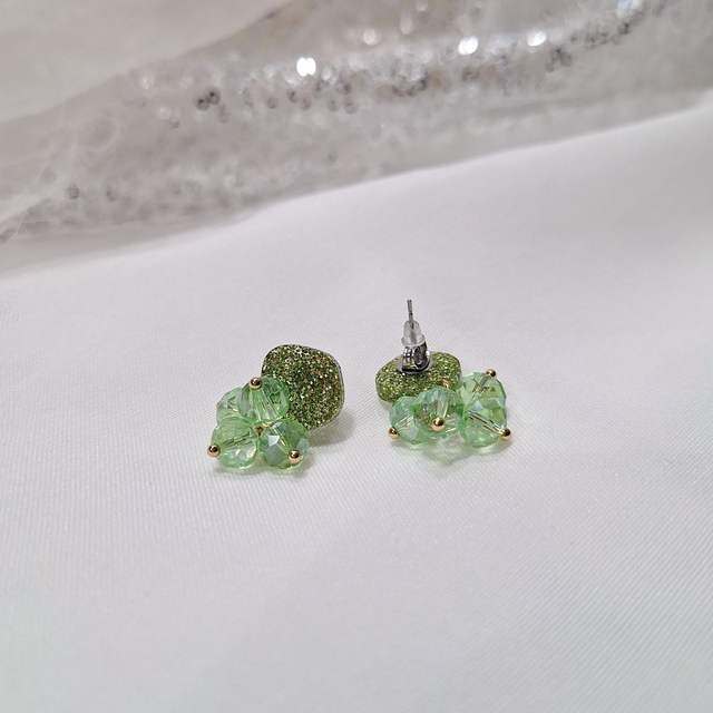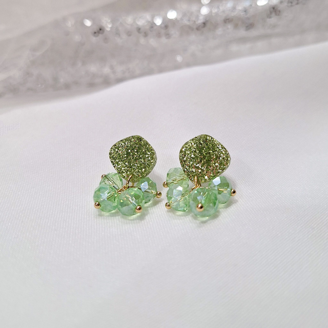 Vihreät helmikorvakorut on valmistettu glitterakryylistä ja lasihelmistä. Glitterakryyli ja hohtavat helmiäisyksityiskohdat luovat harmonisen kokonaisuuden, joka sopii niin arkeen kuin juhlaan.