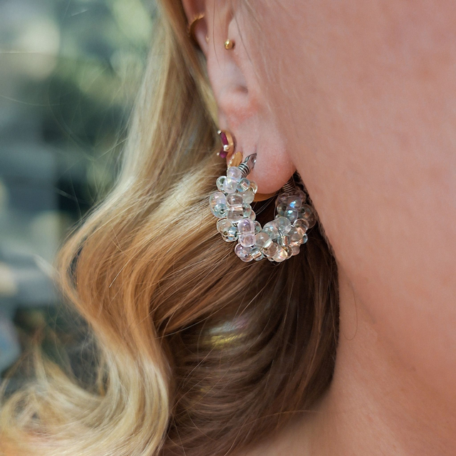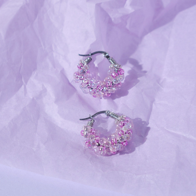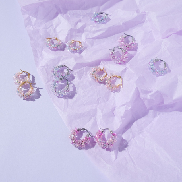 Helmirenkaat on punottu lasisista siemenhelmistä, jotka heijastelevat valossa kauniisti. Korvarenkaat on kirurginterästä, mikä tekee niistä kestävät ja allergiaystävälliset. Punonnassa on käytetty nikkelitöntä kuparilankaa.