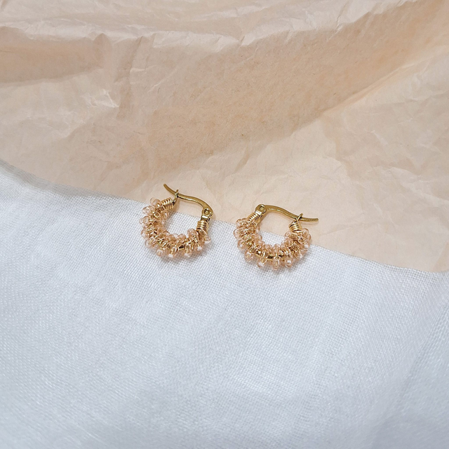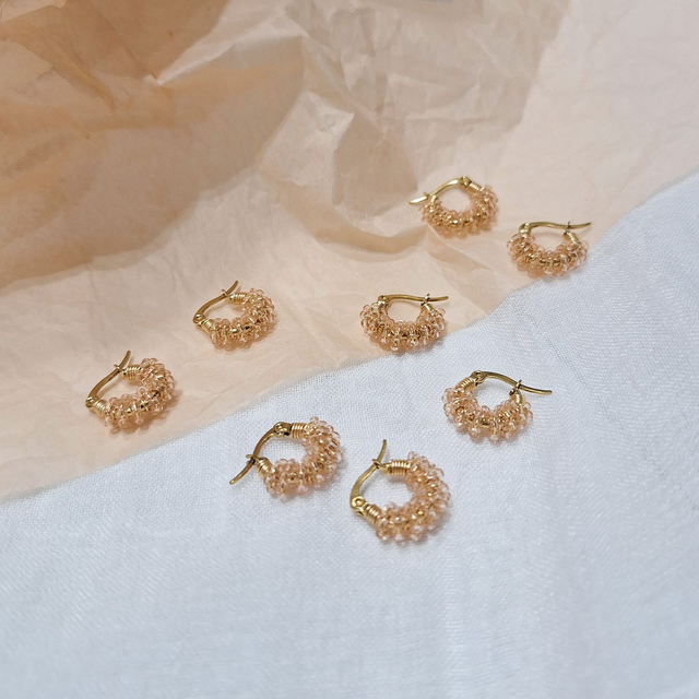 Helmirenkaat on punottu lasisista siemenhelmistä, jotka heijastelevat valossa kauniisti. Korvarenkaat on kirurginterästä, mikä tekee niistä kestävät ja allergiaystävälliset. Punonnassa on käytetty nikkelitöntä kuparilankaa.