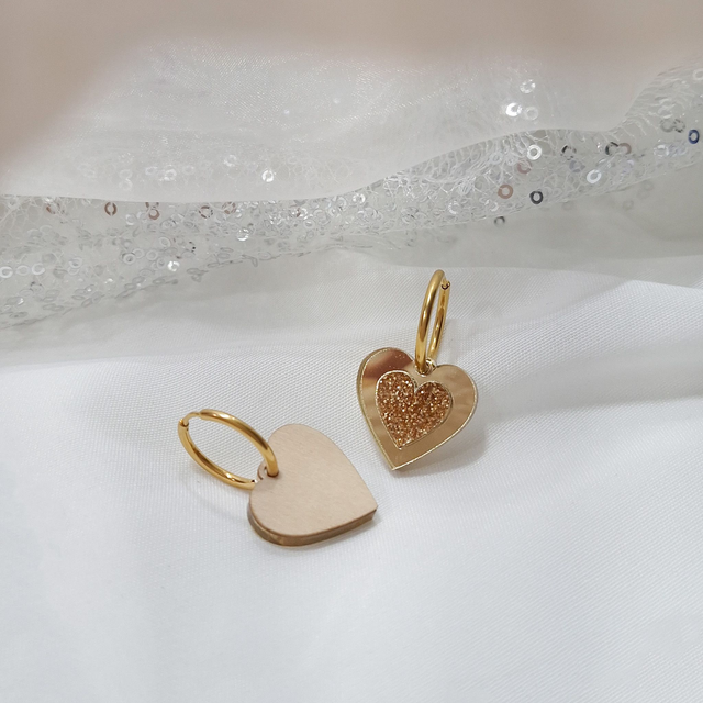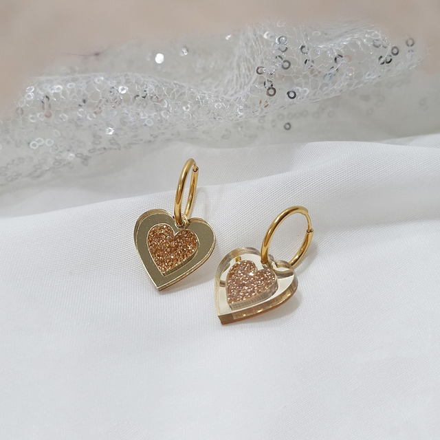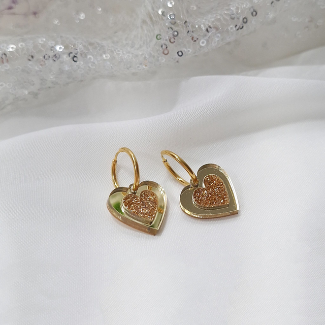 Sydän-korvakorut on valmistettu peili- ja glitterakryylistä. Korvakorut roikkuvat kirurginteräksisessä renkaassa. Näissä sydän-korvakoruissa on sydäntä ja säihkettä!