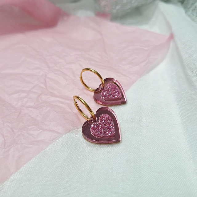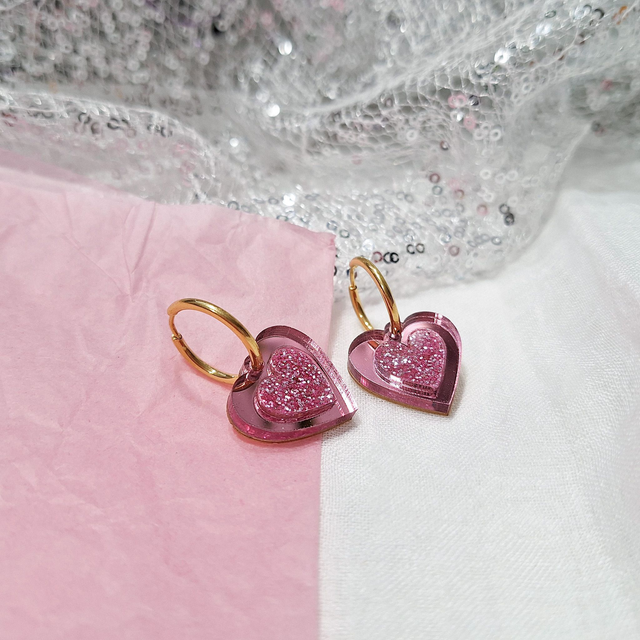Sydän-korvakorut on valmistettu peili- ja glitterakryylistä. Korvakorut roikkuvat kirurginteräksisessä renkaassa. Näissä sydän-korvakoruissa on sydäntä ja säihkettä!
