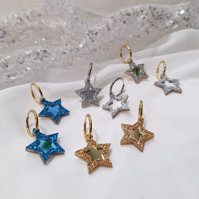 Loista kuin tähti! Näissä korvakoruissa yhdistyvät peiliakryyli ja glitterpinta, jotka tuovat korviin ripauksen taivaanhohtoa. Kevyet, näyttävät ja iloisen säihkyvät tähti-korvakorut lisäävät tyyliisi ripauksen tähtipölyä.