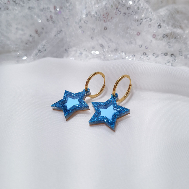 Loista kuin tähti! Näissä korvakoruissa yhdistyvät peiliakryyli ja glitterpinta, jotka tuovat korviin ripauksen taivaanhohtoa. Kevyet, näyttävät ja iloisen säihkyvät tähti-korvakorut lisäävät tyyliisi ripauksen tähtipölyä.