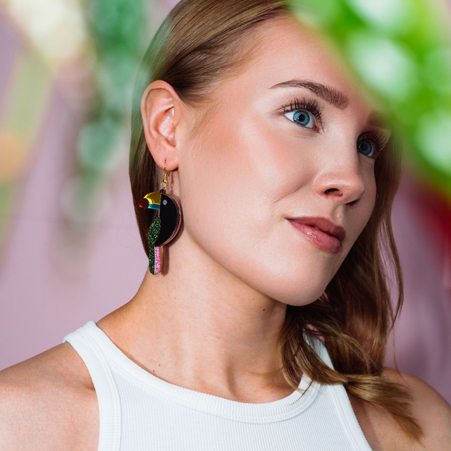 Viidakon viehätyksen inspiroimat korvakorut ovat täällä! Tukaani-korvakorut tuovat ripauksen eksoottisuutta ja väriä arkeen. Nämä leikkisät korvakorut on valmistettu peili- ja glitterakryylistä, jotka tuovat koruihin säihkettä ja hohtoa.