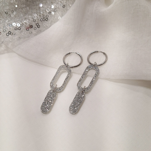 Kimaltelevat hopeat Välke-korvakorut on valmistettu glitterakryylistä. Näissä korvakoruissa yhdistyy moderni muotokieli ja juhlava kimallus. Kirurgisessä renkaassa roikkuu toisiinsa linkittyneet soikeat muodot, jotka välkkyvät ja heijastavat valoa.