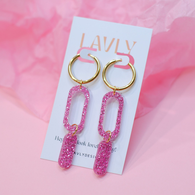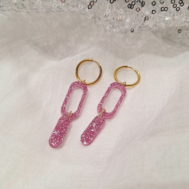 Kimaltelevat pinkit Välke-korvakorut on valmistettu glitterakryylistä. Näissä korvakoruissa yhdistyy moderni muotokieli ja juhlava kimallus. Kirurgisessä renkaassa roikkuu toisiinsa linkittyneet soikeat muodot, jotka välkkyvät ja heijastavat valoa.